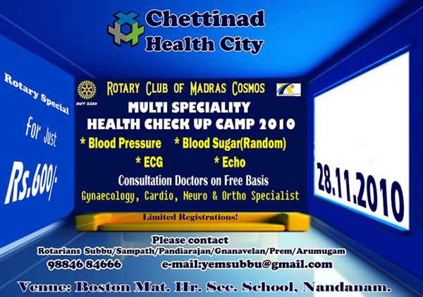 CHECK Your Blood Pressure Blood Sugar(Random) ECG ECHO WITH CHETTINAD HEALTH CITY for just Rs.600/- only on 28.11.2010. @ Boston International Scool, Nandanam