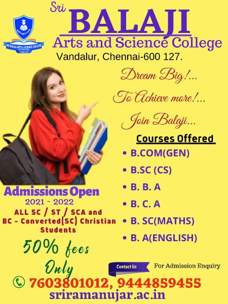 Sri Balaji Arts & Science college Admissions open : 50% Fees only