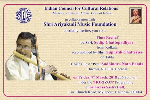 Flute recital by Shri Sudip Chattopadhyay Accompanied by Shri Supratik Chatterjee on Tabla On the Friday, March 9, 2018 at 6.30 pm.