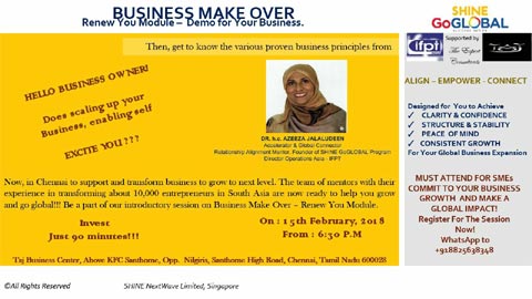 Now, in Chennai to support and transform business to grow to next level. The team of mentors with their experience in transforming about 10000 entrepreneurs in south Asia are now ready to help you grow and go global.