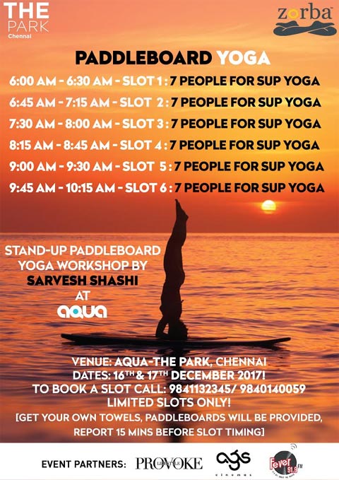 Zorba conducting biggest events called Paddleboard Yoga by Zorba, in Chennai this weekend (16th & 17th Dec 2017), in The Park Hotels, Chennai.