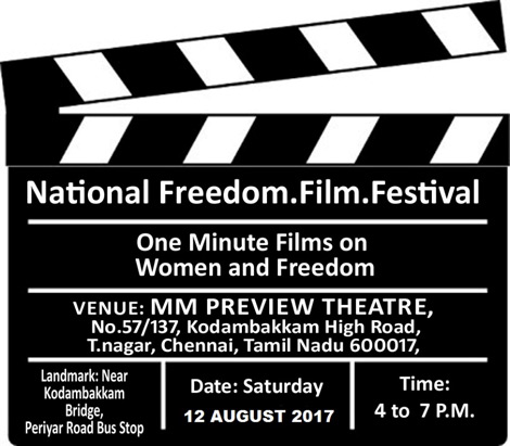 National Freedom Film Festival and the award ceremony will be held on Saturday, 12 August 2017 from 4 pm to 7 pm at MM Preview Theatre, Kodambakkam.
