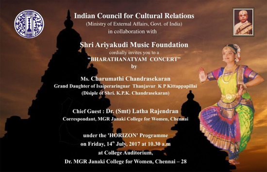 Bharatha Natyam Concert by Ms. Charumathi Chandrasekaran (Grand Daughter of Isai PerarignarThanjavur K.P. Kittappa Pillai ) on Friday, 14th July 2017 at 10.30am.