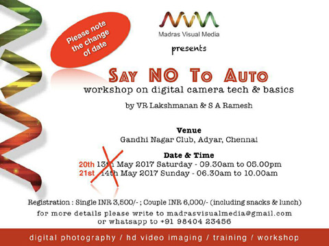 Madras visual media presents Say No To Auto - workshop on digital camera tech & basics by VR Lakshumanan & S.A. Ramesh on 20th & 21st May.