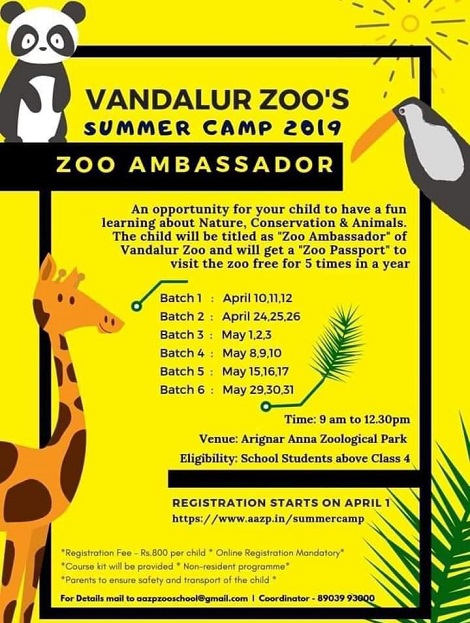 An opportunity for your childto have a fun learning about Nature, Conversation and Animals, The child will be titled as �zoo ambassador� of Vandalur zoo and will get a "Zoo Passport" to visit your zero fee for 5 times in a year