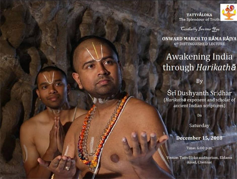 It is our pleasure to extend this invitation to you to attend our forthcoming Onward March to Rama Rajya distinguished lecture on Awakening India through Harikathā by Sri Dushyanth Sridhar.