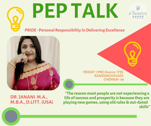 iSource empowering people to perform at their best! Together we can make difference; Pep talk by Dr. Janani M.A., M.B.A., D.Litt. (USA) on 14th December.