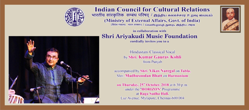 Hindustani Classic Vocal Program by Shri Kumar Gaurav Kohli (from Punjab) accompanied by Shri Vikas Naregal on Tabla and Shri Madhusoodan Bhatt on Harmonium on the Thursday, 25th Oct.