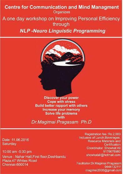 Centre for communication & management organize a one day workshop on improving personal efficiency through NLP (Neuro Linguistic Programming) on 11 June, 2016.