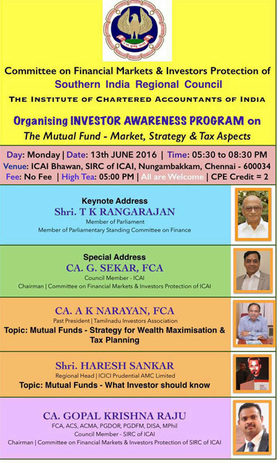 Committee on financial markets & investors protection of South India regional council The Institute of Character Accountants of India organising Investor Awareness Program.