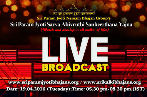 Sri Param Jyoti Sarva Abivruthi Sankeerthana Yajans live broadcast is scheduled on Apr 19, 2016.