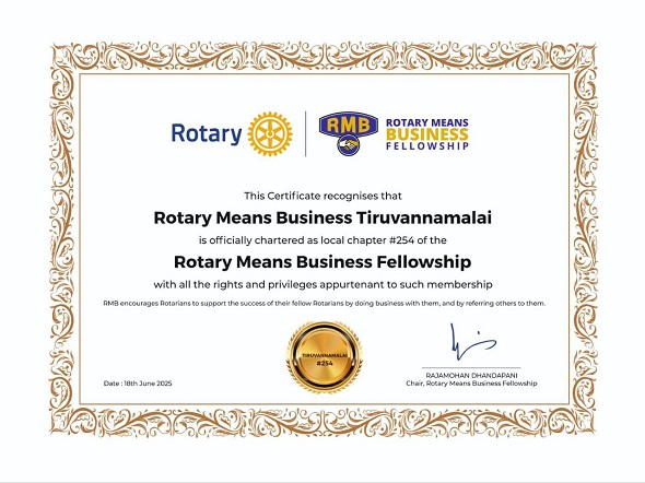Congratulations to all RMBF(Rotary Means Business Fellowship)THIRUVANNAMALAI CHAPTER Members and Head Table Chairman Rtn.Vincet,Vice Chairman Rtn.Deepak,Secretary Rtn.Raghav Karthikeyan and Treasurer Rtn.Manikandan for getting RMBF Charter on 18th June during The RI Designated Month June Rotary Fellowship month