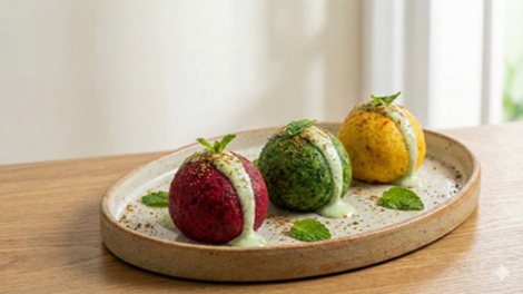 Chilled dahi spheres infused with natural colours from beetroot, spinach, and saffron, finished with a drizzle of sweet mint yoghurt for a refreshing festive burst.