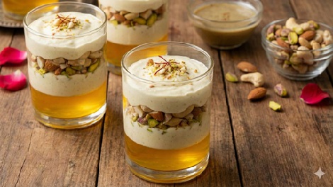 Layers of thandai-infused cream, crushed nuts, and saffron milk jelly for a chilled dessert that captures the cool spirit of Holi.