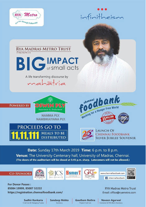 Rya Madras Metro Trust presents Big Impact of small acts, a life transforming discourse by Mahatria on 17th March.