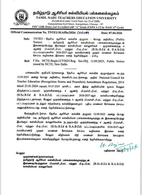 The Tamil Nadu Teachers Education University has announced that 4-year integrated B.Sc B.Ed and B.A B.Ed courses will not be offered from the 2026–27 academic year.