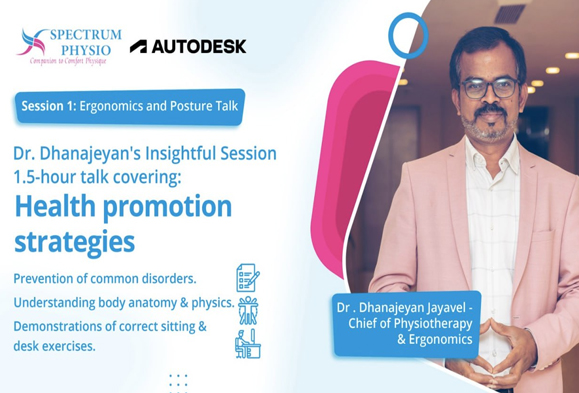 SPECTRUM PHYSIO collaborates with Autodesk to present an informative session on workplace well-being. Led by Dr. Dhanajeyan Jayavel, Chief of Physiotherapy & Ergonomics, the 1.5-hour talk covers health promotion strategies, disorder prevention, and practical demonstrations of correct sitting and desk exercises. The collaboration emphasizes the importance of ergonomics and posture for a healthy and productive work environment.