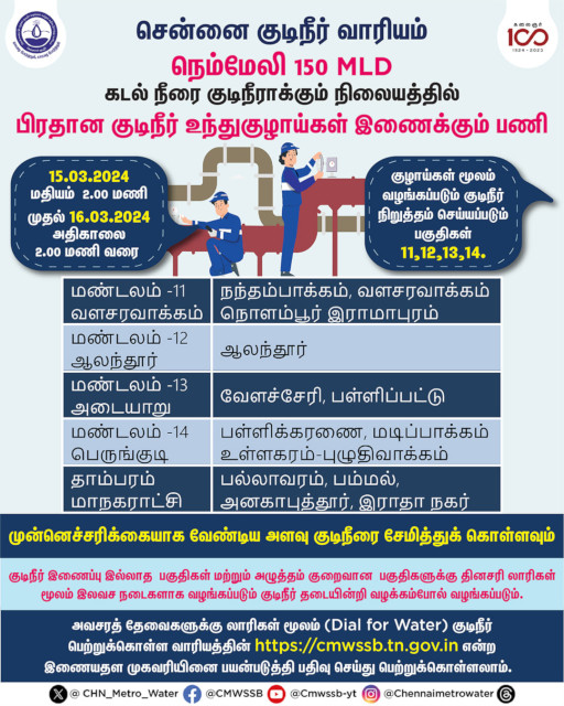 Chennai Metro Water announces maintenance work on the main water pumps at the Nemmeli Sea Water Desalination Plant. Scheduled from 15th March 2024, 2:00 PM to 16th March 2024, 2:00 AM, this maintenance will affect water supply to areas 11, 12, 13, and 14. Residents are advised to store sufficient drinking water as a precautionary measure.