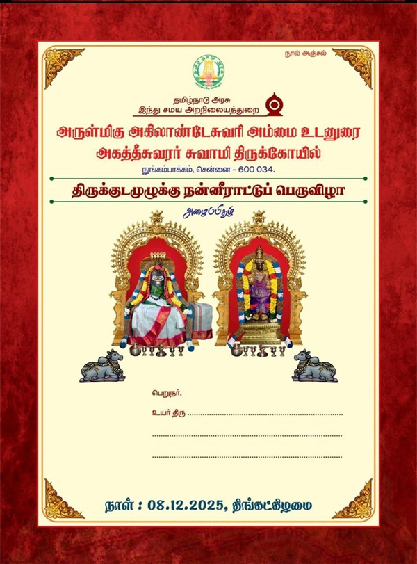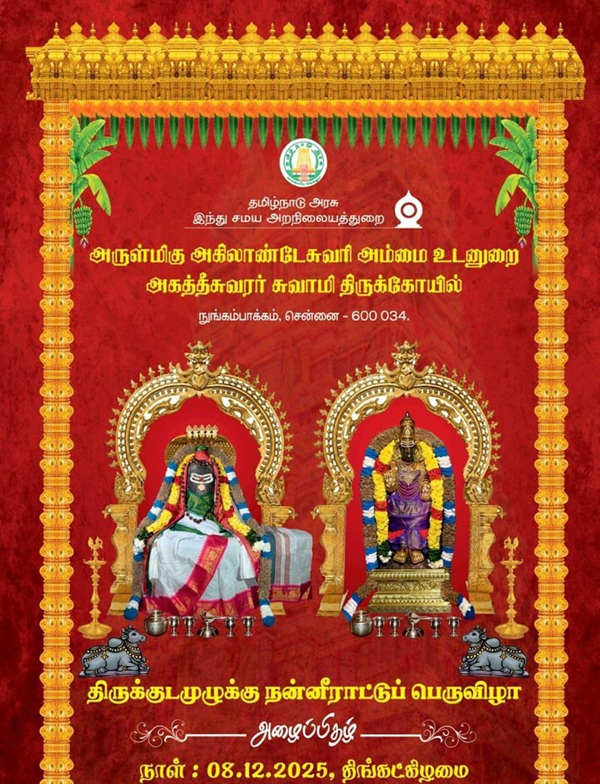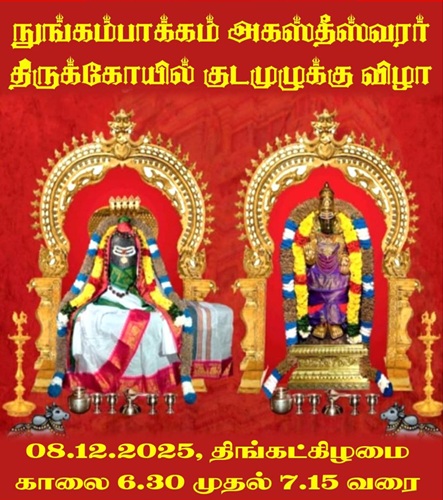 The Maha Kumbabhishekam ceremony of the historic Agatheeswarar Temple located in Nungambakkam, Chennai, is scheduled to take place on Sunday, 08 December 2025, between 6:30 AM and 7:15 AM.