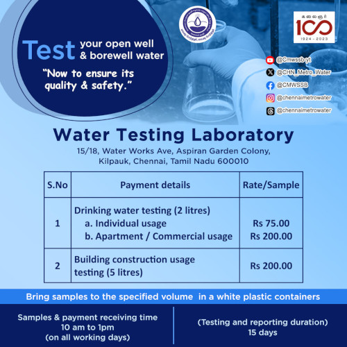 Chennai Metro Water invites you to ensure the quality and safety of your open well and borewell water by testing it now.