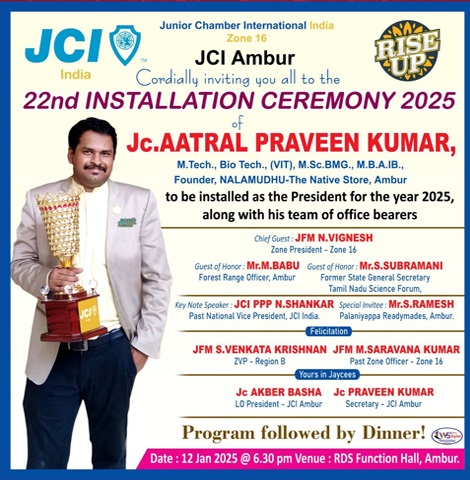 On 12th January 2025, the 22nd Installation Ceremony will take place at the RDS Function Hall, where JC Aatral Praveen Kumar, the Founder of Nalamudhu - The Native Store, will officially take on the role of President for the year 2025. He will be accompanied by his dedicated team of office bearers.