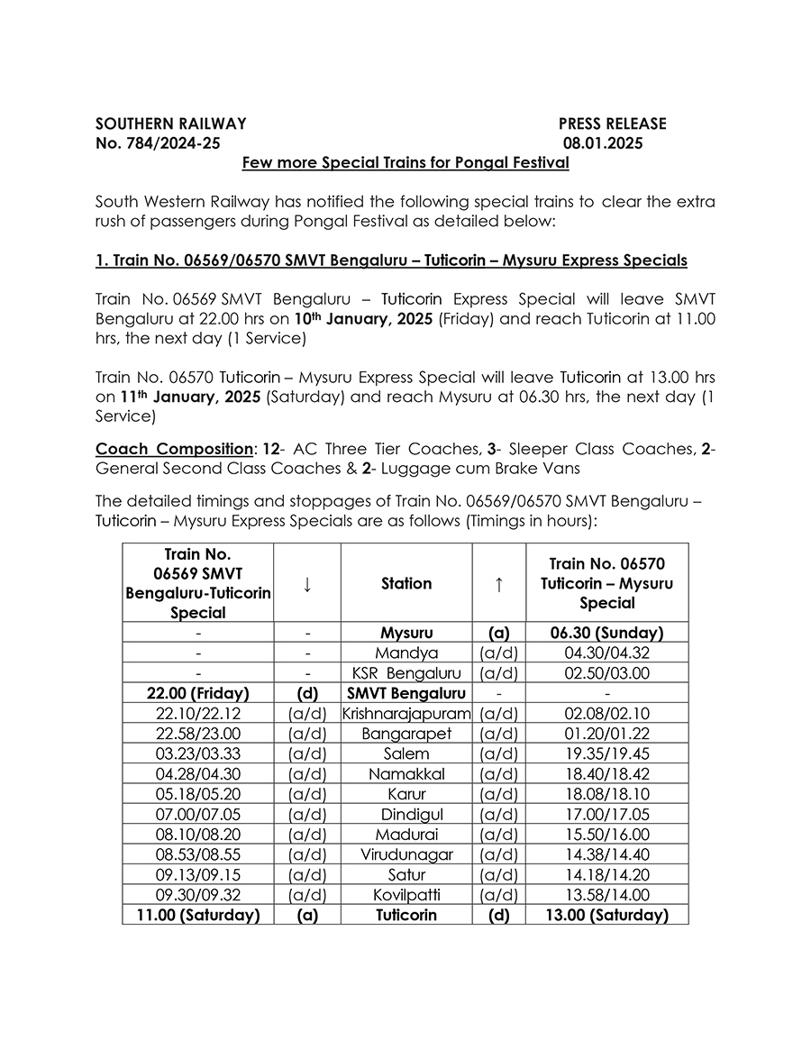To cater to the extra rush of passengers during the upcoming Pongal festival, the South Western Railway has announced special train services. The details are as follows: