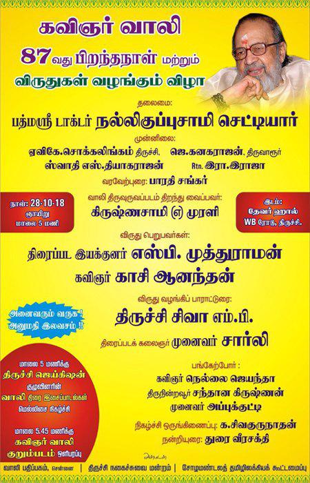 87th Birth Anniversary celebration of Legendary Kavingar Vaali will be held on 28th October at Devar hall, WB road, Trichy.