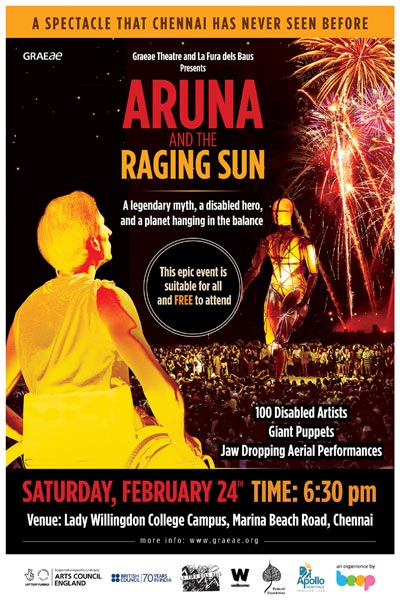 Internationally acclaimed performance companies Graeae (UK) and La FuradelsBaus (Spain) will present �Aruna and the Raging Sun� a large-scale disabled-led show in Chennai, India on Saturday 24th February 2018 at the Lady Willingdon College Campus near Marina Beach. This event is part of the final phase of British Council�s UK-India Year of Culture that aims to celebrate modern day India and inspire millions of young people to build a shared future.