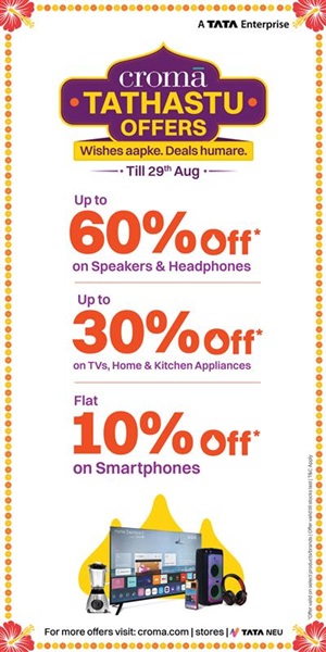 Shoppers can make the most of the season withth exclusive deals on Croma-branded products and the option of ZipCare protection plans for added peace of mind. Flexible payment options are also in place. Instant in-store savings are available with Amex, Axis Bank, HDFC Bank, and OneCard on credit card EMIs, and with Canara Bank on both full swipe and EMI. Benefits go up to ₹20,000, with category caps of ₹2,000 on laptops and ₹1,000 on mobiles. These offers are valid across offline stores in Maharashtra, Gujarat, Karnataka, Andhra Pradesh, Telangana, Madhya Pradesh, Tamil Nadu, and Goa from August 22 to 29, 2025. Offers also valid on Croma.com and Tata Neu.