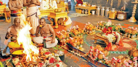 Jyestabhishekam, a three day annual fete began on a vibrant note on Wednesday at the temple of Lord Venkateswara. In correlation with the yearly day annual fete to which colossal significance was attached among all the other temple rituals, the processional idols of Lord Malayappa along with his two divine consorts were taken out to the Sampangi prakaram where homam was performed amidst of chanting of Vedic hymns by the priests.