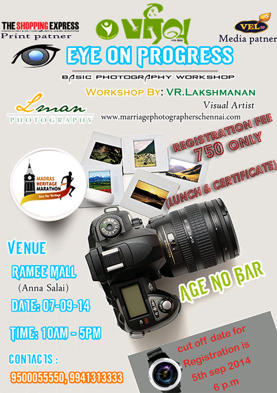 Photography workshop is going to be held at Ramee Mall in Chennai. Main Event organiser Mr. VR. Lakshmanan, Visual Artist. Print Patner - The Shipping Express, Media Patner - Vel TV. Registration fees is Rs. 750 with lunch and certificate. Anyone can participate. Venue - Ramee Mall, Annasalai, Date - 07/09/2014. Time - 10AM to 5AM.