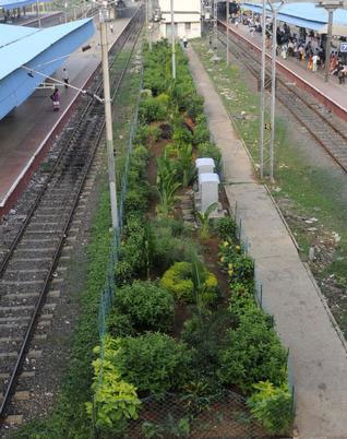 Passengers who alight form long distance trains at Mambalam and Tambaram railway stations, a long green patch with bunches of colourful flowers greets them.