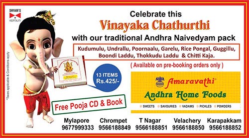 Rejoice Ganesh Chathurthy with elite traditional Andhra Naivedhyam pack 1 kg for Rs. 425. The pack contains 13 luscious Andhra dishes and get a FREE pooja CD and pooja book. Get a blessing from lord Vinayaga! This offer is only available on pre-booking orders!