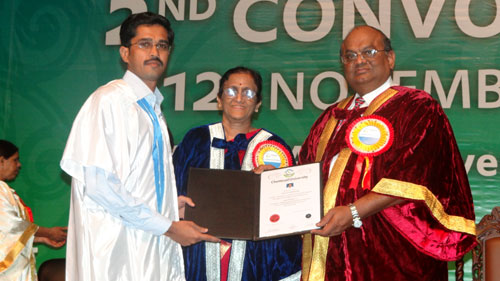 Chettinad University, a University with a promise of excellence held its second Convocation today at its magnificent campus on the out skirts of Chennai. Dr.Mayil Vahanan Natarajan , Vice Chancellor , The Tamil Nadu Dr.M.G.R.Medical University was the Chief Guest and delivered the convocation  address and presented the Rajah Muthiah and Sigapi Awards for proficiency to the students. Five students received the awards. Dr.M.A.M.Ramaswamy  , the Chancellor presided over the function and handed over the Degree and Diploma certificates to the graduating students. A total of 39 students graduated this year.