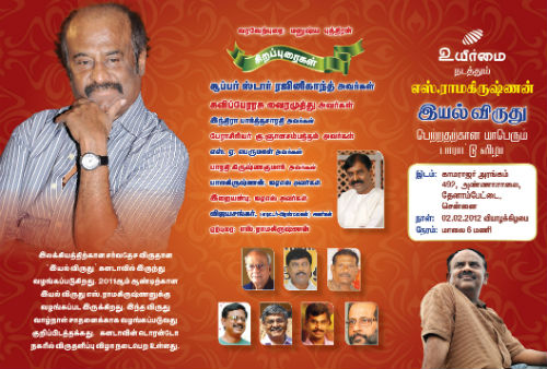 Super star Rajnikanth, Kaviperarusu Vairamuthu and many key personalities are honoring leading Tamil writer S.Ramakrishnan for being conferred a prestigious Iyal literary award, on February 2, 2012, Thursday at Kamarajar Arangam, 292, Anna Salai, Teynampet, Chennai, 6.00 pm.