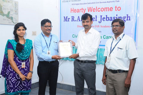Mr. Israel Jebasingh, IAS, Founder and Director, Officers IAS Academy (Anna Nagar), recently addressed the students of KCG College of Technology, Karapakkam. He talked on the topic Civil Service as a Career and shared his experience and expertise in Civil Service Examinations. He interacted with select group of students and cleared their doubts on how to approach UPSC examinations.