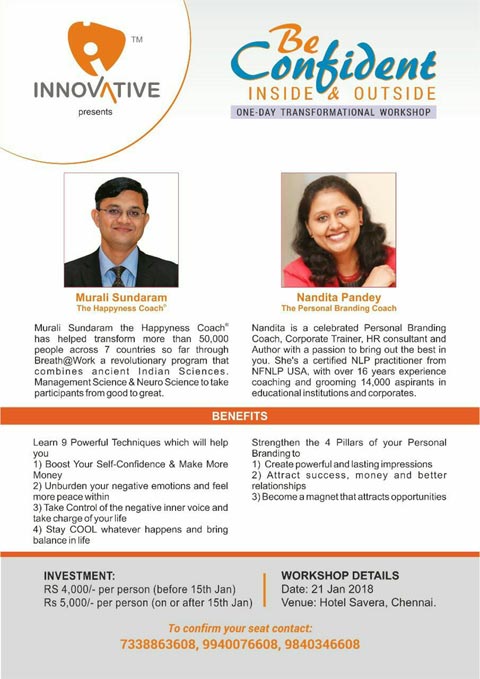 Two great life coaches are coming together on the same platform Nandita Pandey with her How to alter your appearance and build a better image and Murali Sundaram with his module for planting seeds of happiness and peace in every heart.