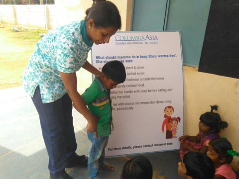 Columbia Asia Hospital Whitefield on the occasion of National De-worming day had organized an awareness program at the Vijayanagar govt. school. National Deworming Day was observed on the 10th February 2018 across India. It is an initiative of the Ministry of Health and Family Welfare, Government of India where all children between the ages of 1-19 years of age will be targeted to receive deworming medicines against parasitic intestinal worms.