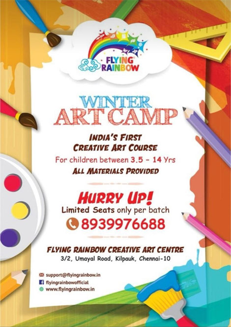 Flying Rainbow Creative Art Centre is a Creative Concept Art School (TM) with a structured Curriculum. The structure involves level based syllabus. On completion of each level, students are certified and moved on to the next level. Each student is given individual attention and coaching. Creative teaching methods are used to teach concepts to children-and they are encouraged to share their views about their creations. The classrooms are set up in a creative and inspiring environment. All students are provided with a Kit containing all the materials required for the art class. The mission of Flying Rainbow is to empower children with Art skills to use in their everyday life, thereby enhance themselves to become stronger and smarter to face the future world in creative ways.
