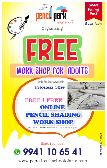Pencil Park School of arts is organising a Free Online Art Workshop for adults on Pencil Shading done by Professional Artist Mr. Selvam Govindan, B.F.A.