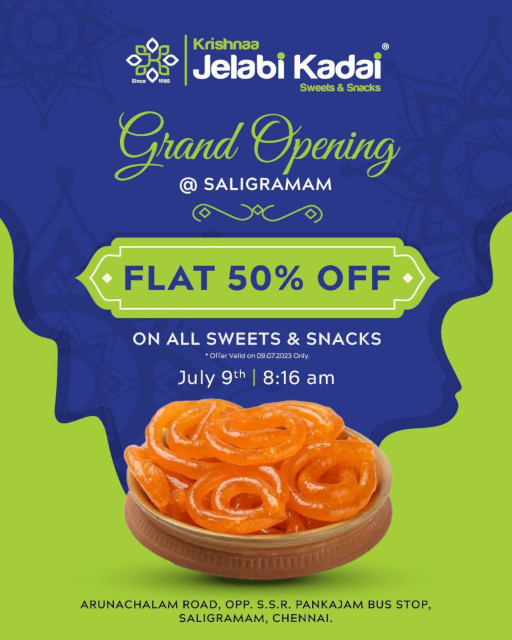 Krishnaa Jelabi Kadai, renowned for their sweets and snacks since 1985, invites you to the auspicious inaugural ceremony of their new showroom. Join us on July 9, 2023, at Arunachalam Road, Saligramam. Experience the sweetness and delightful surprises firsthand. Don`t miss out!