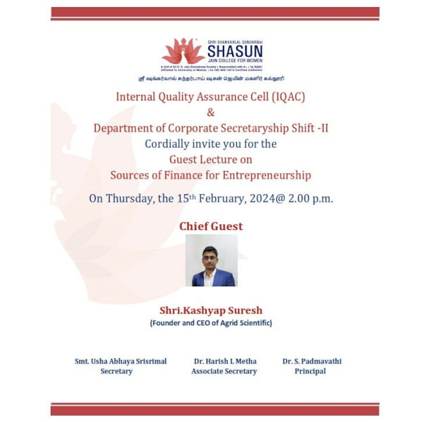 Shri Shankarlal Sundarbai Shasun Jain College for Women`s Internal Quality Assurance Cell (IQAC) and the Department of Corporate Secretaryship Shift - II are set to host an enlightening Guest Lecture on "Sources of Finance for Entrepreneurship" on Thursday, February 15, 2024, at 2:00 P.M.