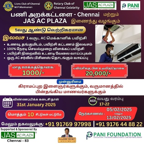 Pani Foundation, in collaboration with JAS AC Plaza, is thrilled to announce the 5th successful edition of their Free 1-Year AC Mechanic Training Program in Chennai. This initiative is designed to empower young individuals with technical skills and create career opportunities in the HVAC industry.