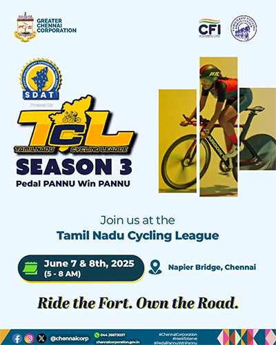The Tamil Nadu Cycling League (Season 3) is all set to take place on June 7 at Napier Bridge, Chennai. The event is jointly organized by the Tamil Nadu Cycling Association, Greater Chennai Corporation, Cycling Federation of India, and the Tamil Nadu Sports Development Authority.