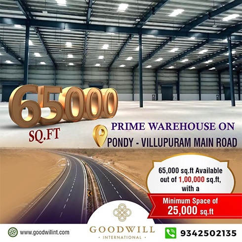 We have 65,000 sq. ft. of warehouse space available for lease on a 100,000 sq. ft. plot along NH-45A, Pondicherry-Villupuram Road.