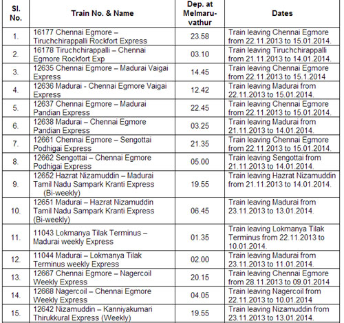 Irumudi/Thaipoosam festival at Melmaruvathur, the following trains will be provided a temporary stoppage of two minutes at Melmaruvathur during the period mentioned against each.