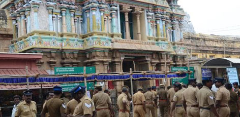 Police security has been beefed up at Sri Kapali Temple in Mylapore since May 1 when the bomb blast in a train at Central Station took place. A few policemen and women are stationed at the entrances and ask people to open bags they may be carrying inside.