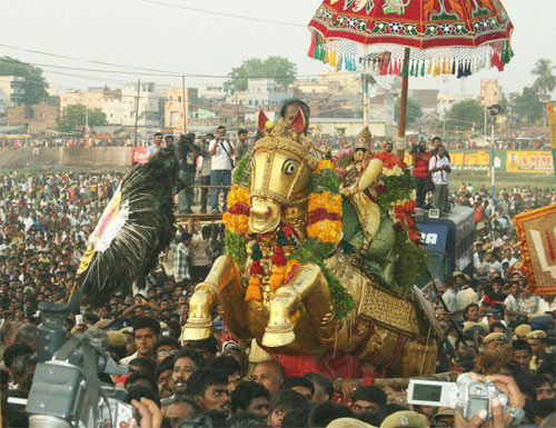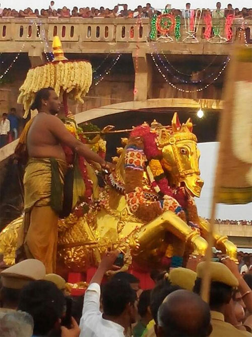 The occasion of Lord Kallazhagar entering the Vaigai River in the golden horse carrier is one the most important and celebrated annual event. It was performed today with all grandeur and glitters.
