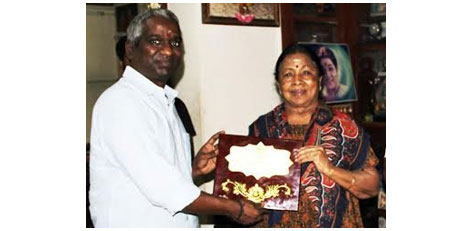 The founder of Take Care India, Mr. Mohammad Ibrahim, visited Manorama�s house with music director Karthik Raja and presented the award.