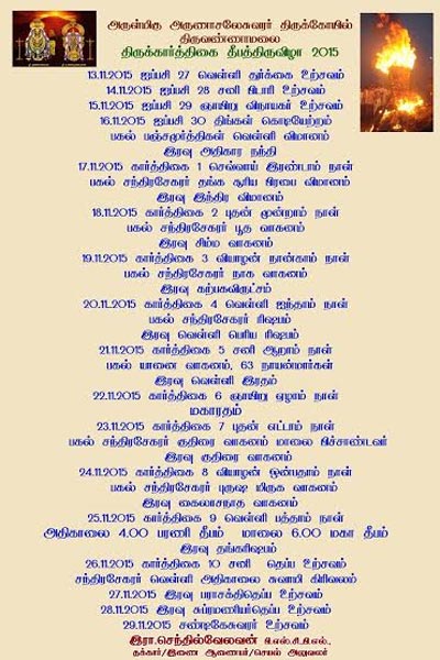 This year the Karthigai Deepam Festival falls on the Sunday November 25, 2015, in Thiruvannamalai. On the day, Lord Arunachaleswarar and His Consort Unnamalai Amman will be taken on procession for the public to worship. In the evening a Maha Deepam will be lit on the top of the Thiruvannamalai Mountain.